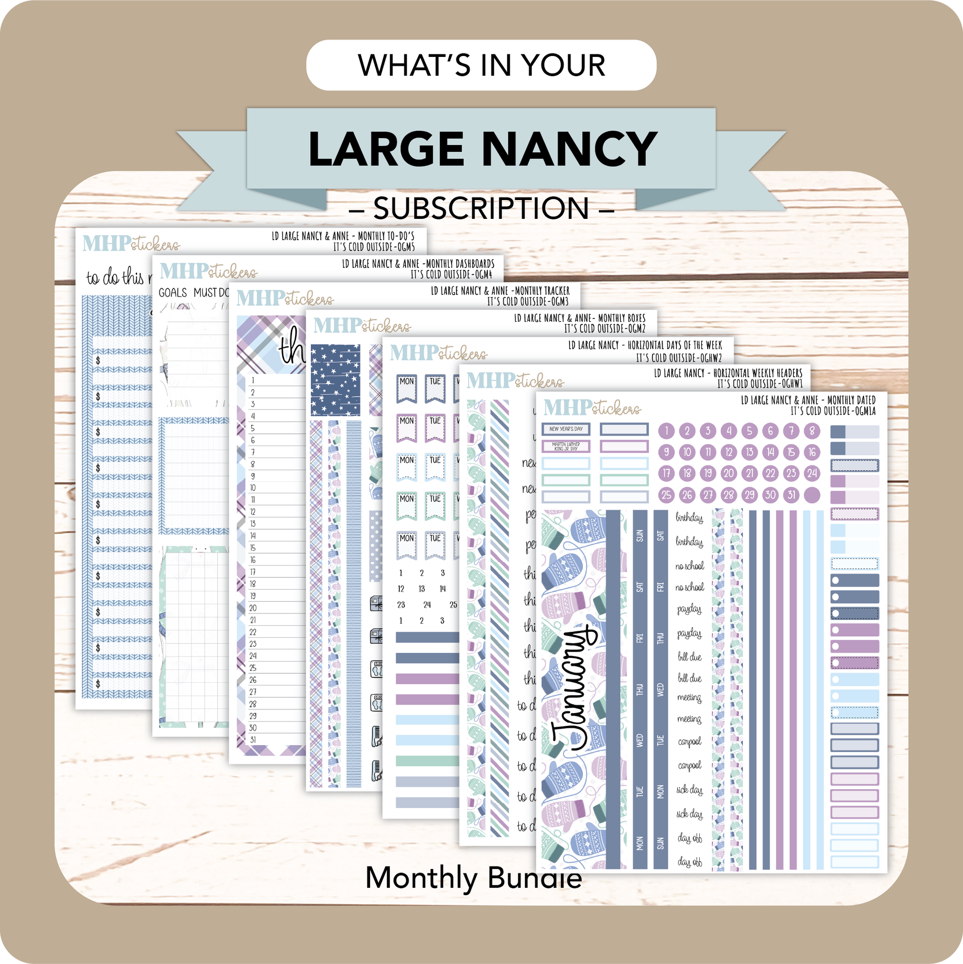 This subscription package is designed for people who use the Large Nancy Laurel Denise Planner. Every month, you'll receive our monthly bundle with plenty of decorative and functional stickers to plan out your month. Our kits are designed to fit perfectly on the mentioned planners above and are printed on premium white matte sticker paper — perfect for jotting down notes, dates, and custom labels!